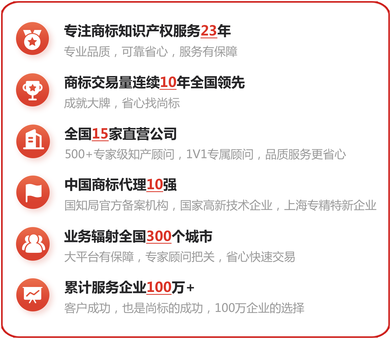 在当前市场环境下,市场竞争日益激烈,行业内卷越来越厉害消费者对品牌意识也越来越强。对于无品牌产品或一般的品牌产品消费者的忠诚度越来越低,“面对这样的挑战和困境,我们该如何应对呢?”尚标专注商标品牌交易23年可以迅速帮您匹配获得一个好品牌,好的品牌深入消费者心中。